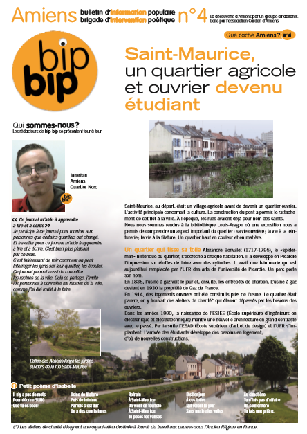 Bip Bip (« Bulletin d’Information Populaire » rédigé par la « Brigade d’Information Populaire ») est un journal populaire, conçu et imaginé par un groupe d’habitants des quartiers d’Amiens « en apprentissage » au Cardan.
