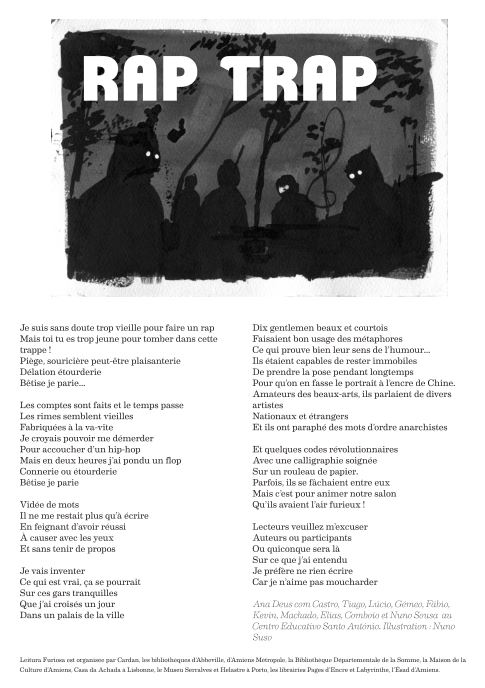 ANA DEUS: “Rap Trap” 20 mai 201821 mai 2018 Cardan Un texte de Ana Deus avec Castro, Tiago, Lucio, Gemeo, Fabio, kevin, Machado, Elias, Comboio et Nuno Sousa au Centro Educativo Santo Antonio. Veuillez cliquer sur le texte pour l’agrandir.