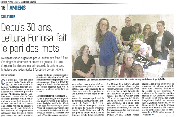 Depuis 30 ans, Leitura Furiosa fait le pari des mots 14 juin 202214 juin 2022 Cardan Un article du Courrier Picard, publié le 21 mai 2022, à l’occasion des 30 ans de Leitura Furiosa. Cliquez sur l’article pour le lire.