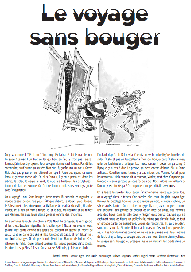 Un texte de Jean-Claude Lalumière avec Aude, Blandine, Corinne, Delphine, Élodie, Florence, Hélène, Linda, Martine, Nadine, Neema, Paula, Tania, Vita et Slava (médiathèque d’Abbeville).